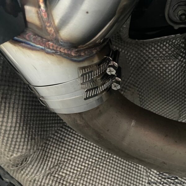 • Tighten the 2 provided exhaust clamps with a 8mm socket; do not use impact wrench on clamps.